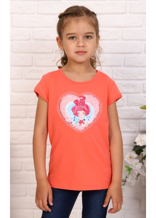 Футболка для девочек дошкольного и младшего школьного возраста из однотонного трикотажного полотна кулирка с лайкрой. Футболка прямого силуэта, с втачным рукавом. Спереди и на спинке отсутствуют линии членения. Рукав одношовный, короткий. Низ изделия подогнут. Срез горловины и нижний срез рукава окантованы. На передней части настрочена нашивка