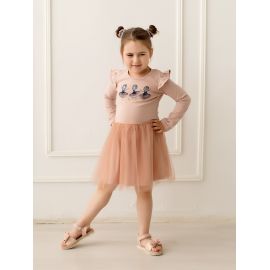Воздушное и невероятно привлекательное платье с юбкой-пачкой из фатина. Любая девочка будет обязательно рада такому пополнению своего гардероба. Платье с длинным рукавом длиной миди. В плечевых швах обрабатывается кокетливая рюша. На полочке нанесены красивые танцующие девочки в оригинальных платьях. И завершающим образ элементом является воздушная юбочка из нескольких слоев.