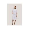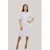 Спинка со средним швом обработанным со шлицей. Рукав втачной длиной ?, с регулировкой по длине с помощью паты. Горловина без воротника фигурной формы. Халат с хлястиком из рельефных швов полочки, регулируется на спинке с помощью трех металлических кнопок. По хлястику, патам и левой полочке настрочена отделочная лента, что делает образ более оригинальным. Ткань пластична и легка в уходе, обеспечивает комфорт в течение дня.