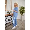 Костюм женский из смесовой или поливискозной гладкоокрашенной ткани, состоящий из туники и брюк Туника из основной ткани прямого силуэта, длиной до бедер спереди и ниже на 5,0 см сзади. Горловина асимметричная, фигурной формы, без воротника, обработана с обтачкой. Перед с нагрудной вытачкой из бокового шва. Спинка со средним швом, в котором обработан разрез от горловины, застегивающийся на пуговицу. Рукав втачной, длиной до локтя. Низ рукава обработан притачной манжетой из отделочной ткани. В боковых швах обработаны разрезы длиной 5,0см. Брюки из основной ткани, чуть заужены к низу. Передние половинки с косыми карманами в боковых швах. Верхний срез обработан с притачным поясом с эластичной тесьмой и шнурком для комфортной посадке на фигуре. В боковых швах втачные лампасы шириной 3,0см из отделочной ткани.