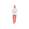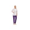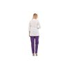 Костюм состоит из куртки и брюк. Куртка белого цвета, отделка в виде цветного канта в рельефах, рукав 3/4, воротник стойка, два нижних кармана. На спине на уровни талии вставлена резинка. Молния белого цвета. Брюки прямые М01, пояс собран на эластичную ленту, без карманов.