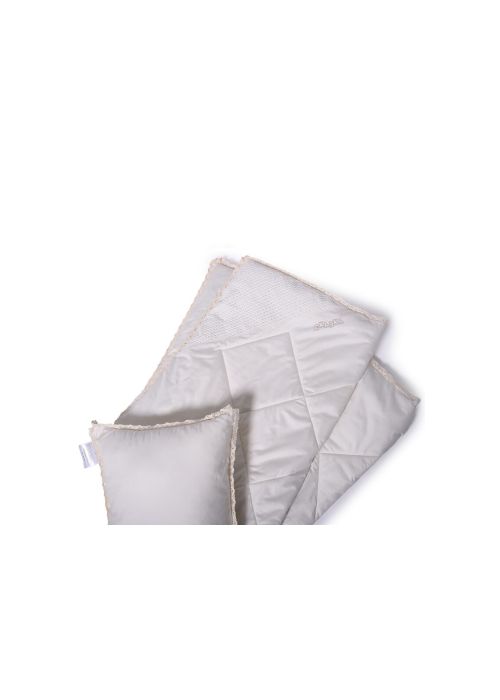 В составе ткани одеяла хлопок 100%, наполнитель — термополотно с хлопковым волокном. Кружевной кант, уголок из узорной ткани и мягкий сливочный цвет одеяла увлекают в сказку, которая обязательно приснится малышу под таким легким и теплым одеялом.