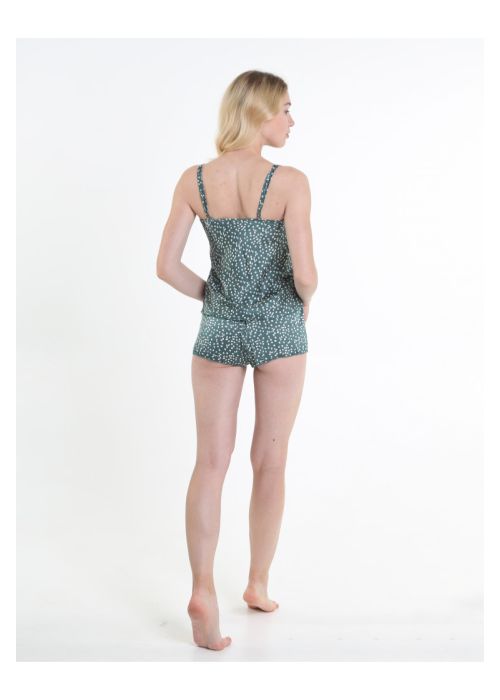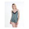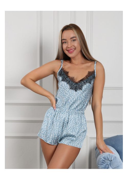 Пижама женская. Выполнена из искусственного шелка. Линия декольте декорирована изящным кружевом. Топ на тонких регулируемых бретелях, шорты на комфортном поясе-резинке.