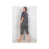 Пижама состоит из футболки и бридж. Футболка особенно комфортного полуприлегающего силуэта из набивного полотна. Рукав короткий цельнокроеный на манжете. Круглая горловина обработана бейкой. Полочка (из двух частей) с принтом, манжеты, бейка круглой горловины выполнены из гладкокрашеного полотна. Низ изделия ассиметричный. Бриджи прилегающего силуэта из насыщенного набивного полотна с цельнокроеным поясом на резинке.