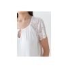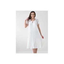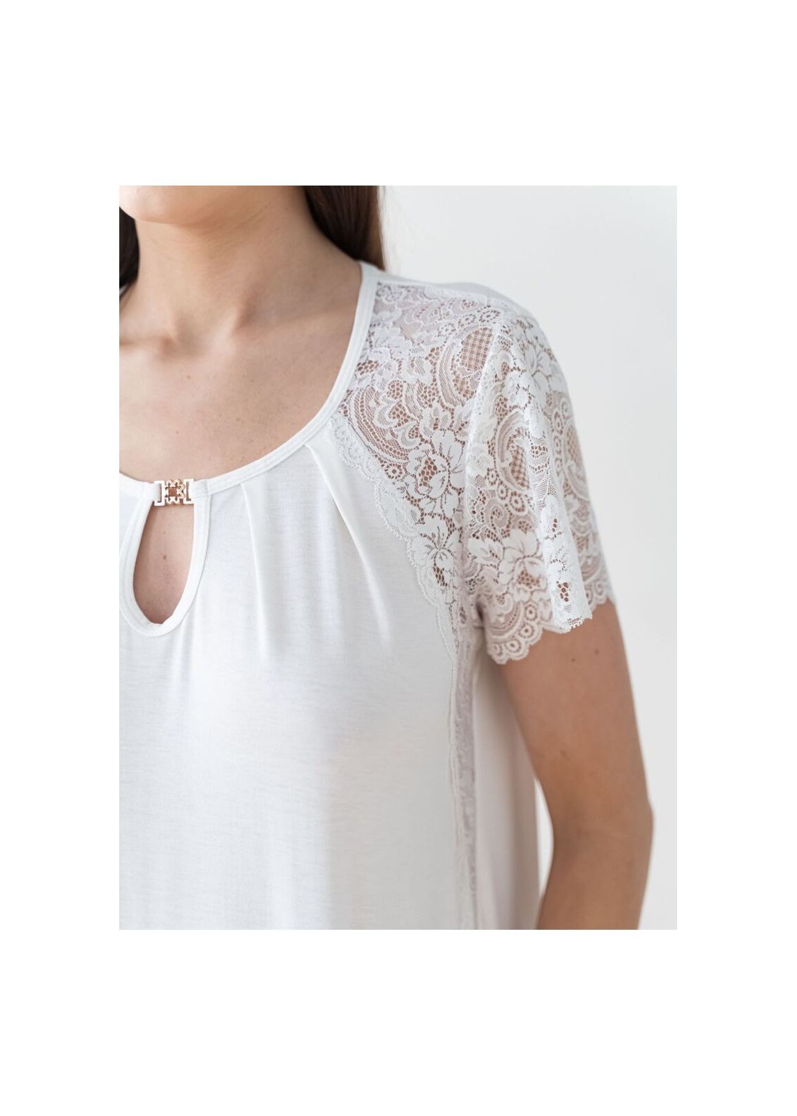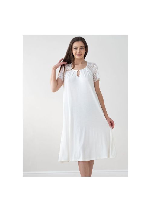 Сорочка трапециевидного силуэта, длиной ниже колена. По горловине переда обработана капелька, закрытая на украшение из металла и заложены односторонние складки. Горловина окантована. Рукав втачной, короткий. Перёд декорирован эластичным кружевом. Рукав выполнен из эластичного кружева.