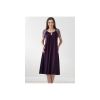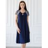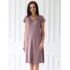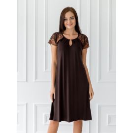 Сорочка трапециевидного силуэта, длиной ниже колена. По горловине переда обработана капелька, закрытая на украшение из металла и заложены односторонние складки. Горловина окантована. Рукав втачной, короткий. Перёд декорирован эластичным кружевом. Рукав выполнен из эластичного кружева.
