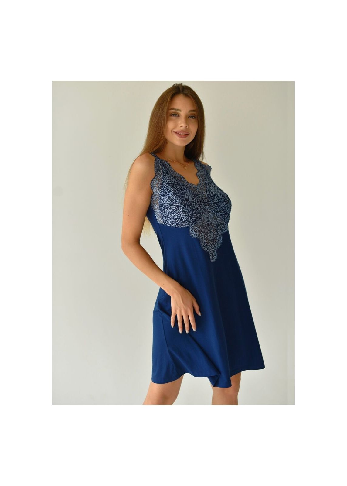 Элегантная сорочка подчеркивает силуэт фигуры. Длина сорочки до колена. Лиф декорирован эффектным кружевом в цвет сорочки.