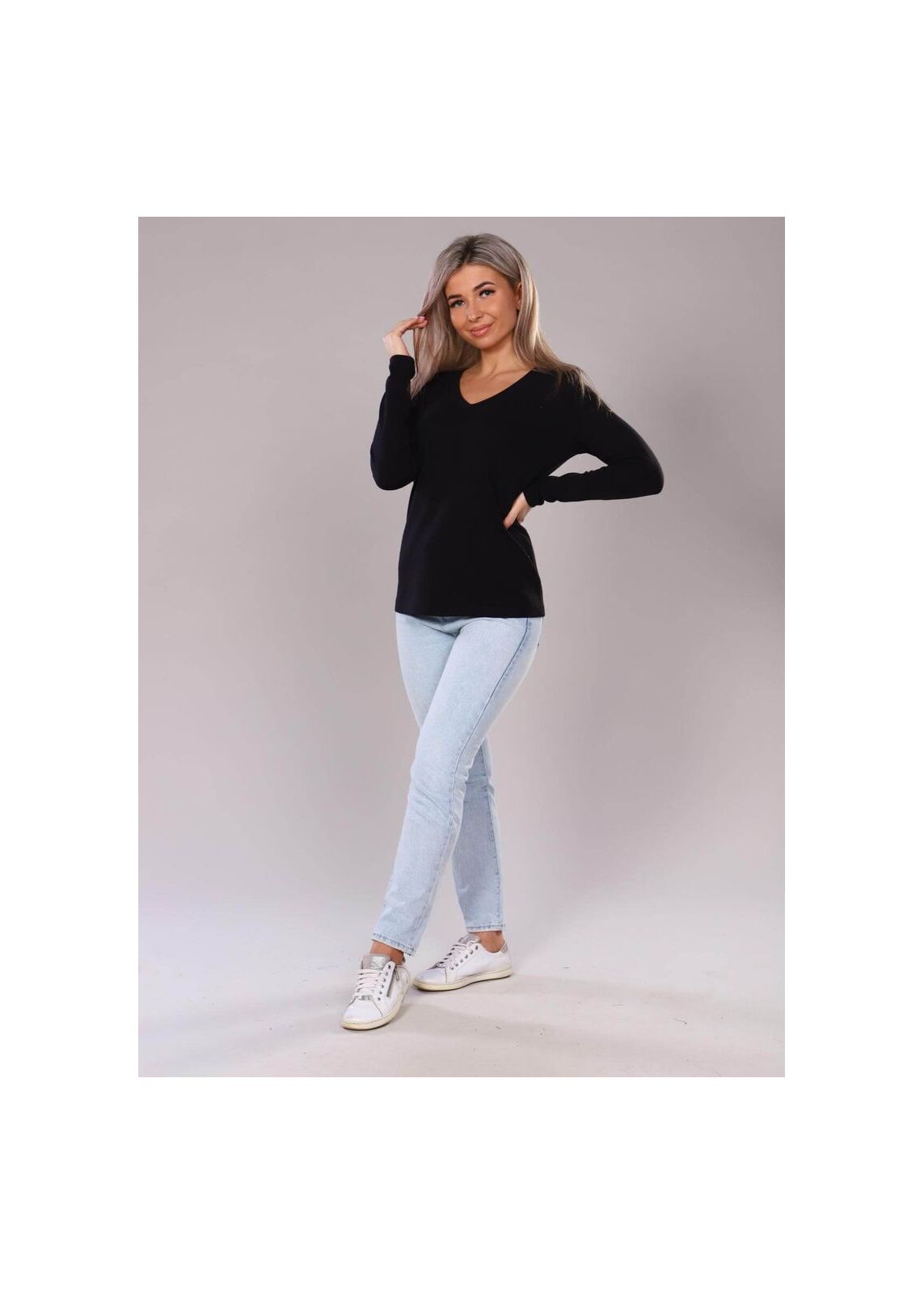 Женский пуловер выполнен из трикотажного приятного к телу полотна "рибана с лайкрой". Не глубокий фигурный вырез и комфортная посадка по фигуре. Модель прямого силуэта, с длинным рукавом, длиной до уровня бедер. Хорошо сочетается с любой одеждой.