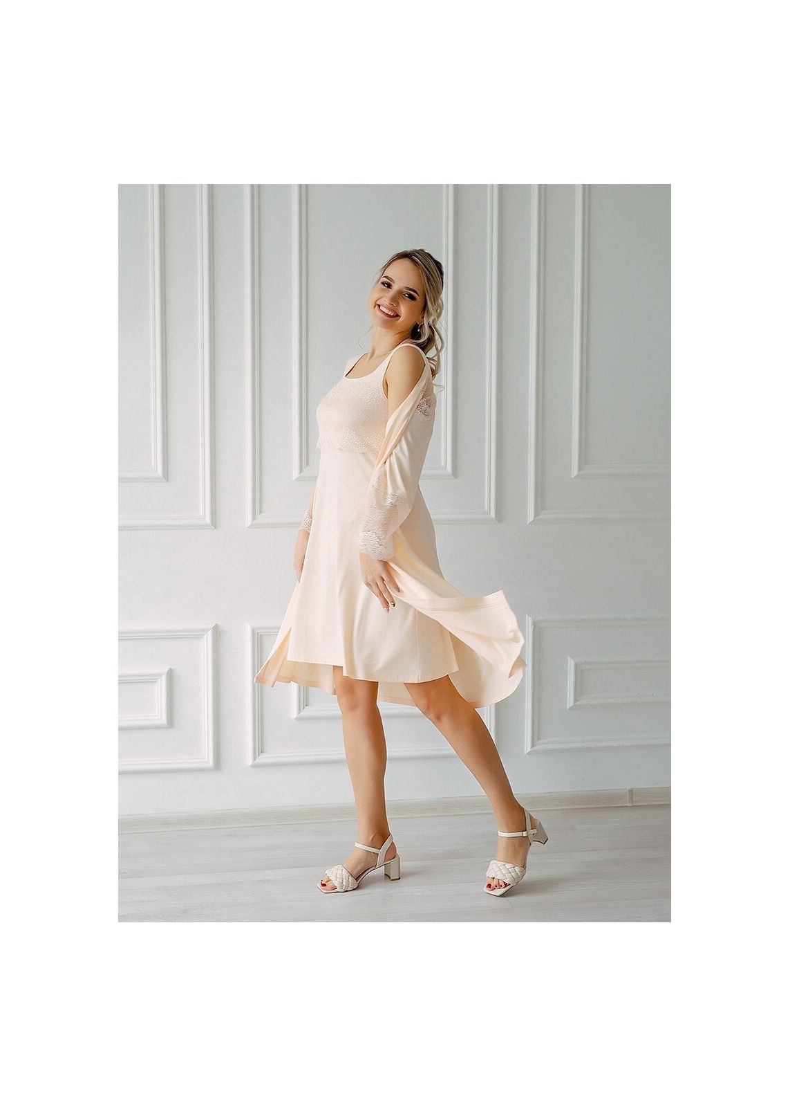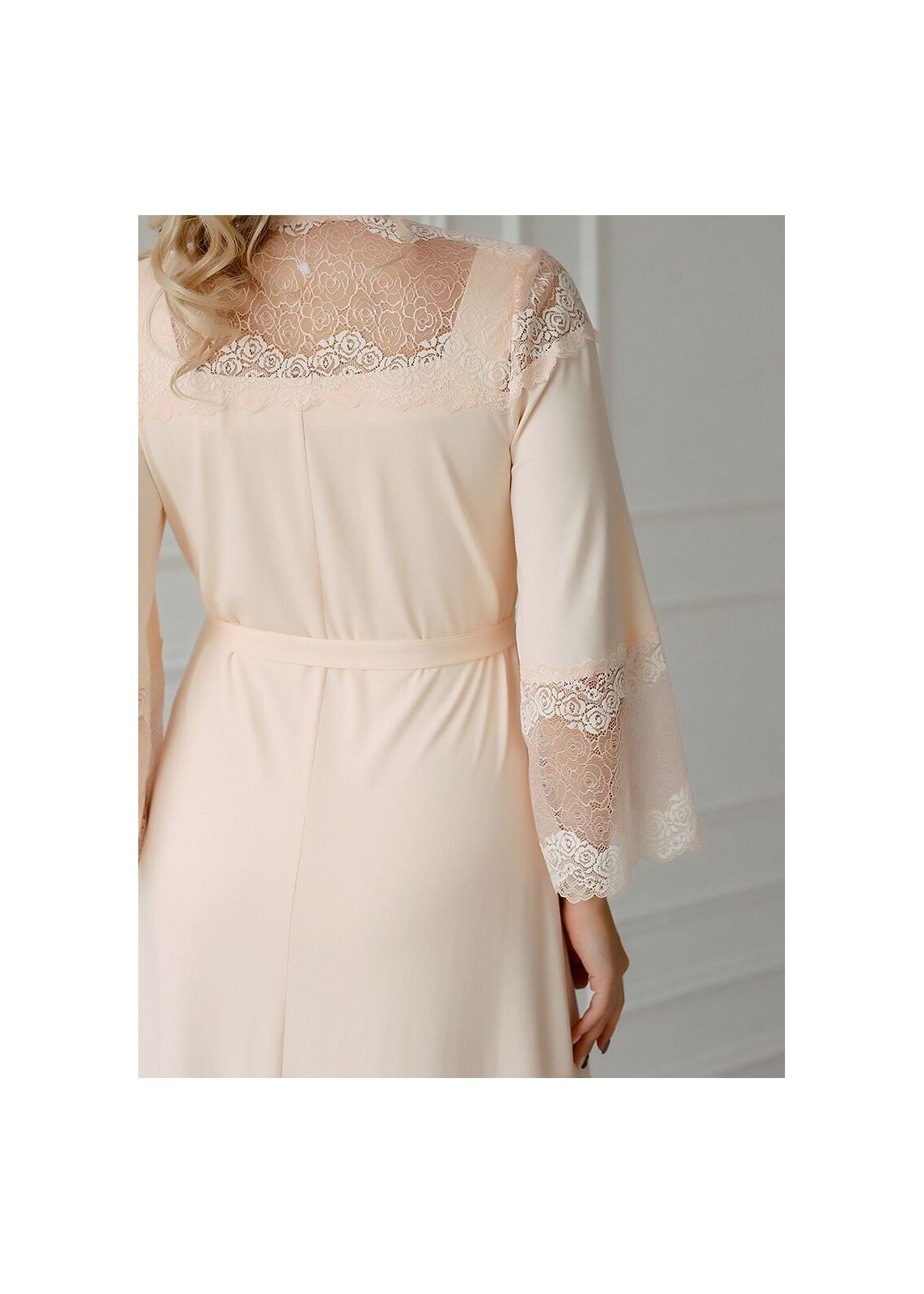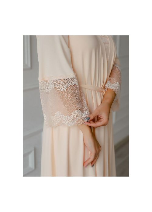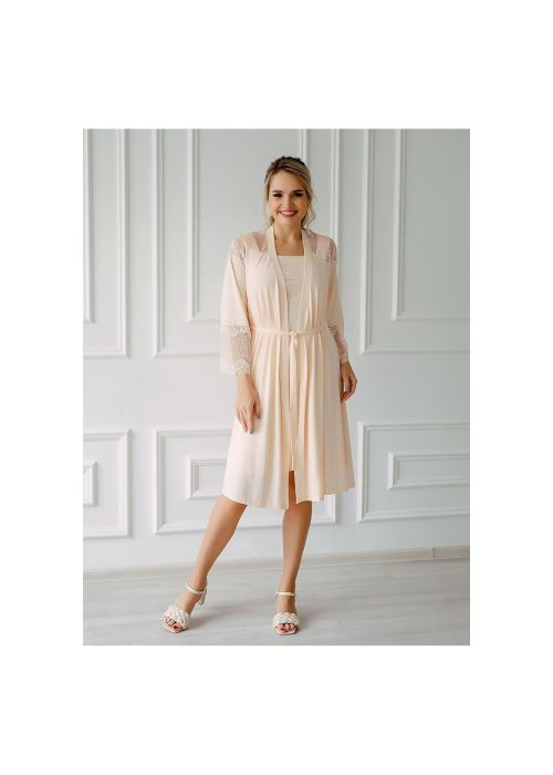 Элегантный женский комплект для дома из вискозы с эластичным кружевом. Состоит из халата и сорочки. Халат запашной, длиною до колена, фиксируется поясом. Верхняя часть полочки, рукавов и спинки декорированы кружевом. Втачные рукава эффектно украшены кружевом по низу.Сорочка прилегающего силуэта, длиной выше колена без рукавов на широких бретелях. Лиф сорочки декорирован кружевом.