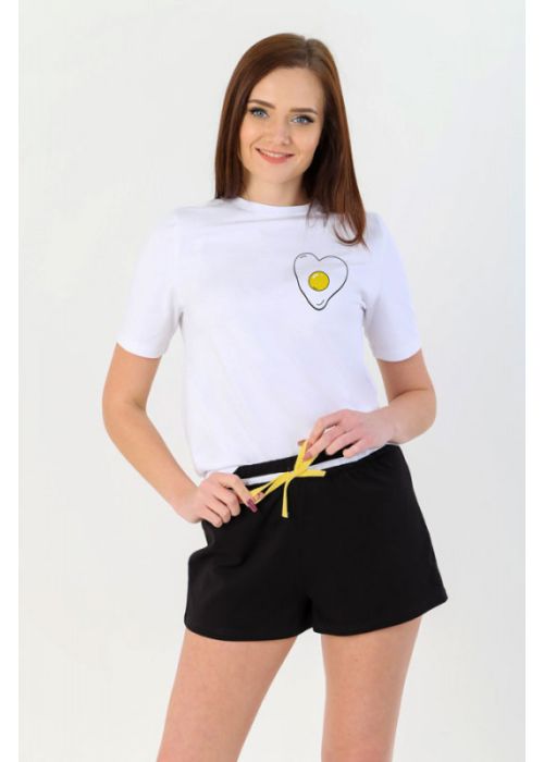 Модный домашний костюм с шортами для девушек. Футболка полуприлегающего силуэта, длиной до уровня бедер. Вырез горловины О - образный. Рукав - втачной, базового покроя. На полочке стильный принт - яичница в форме сердца. Шорты короткие, с высокой посадкой. Пояс на резинке, дополнительно имеет декоративный шнурок.