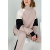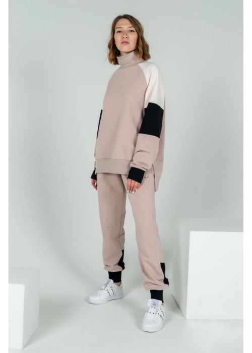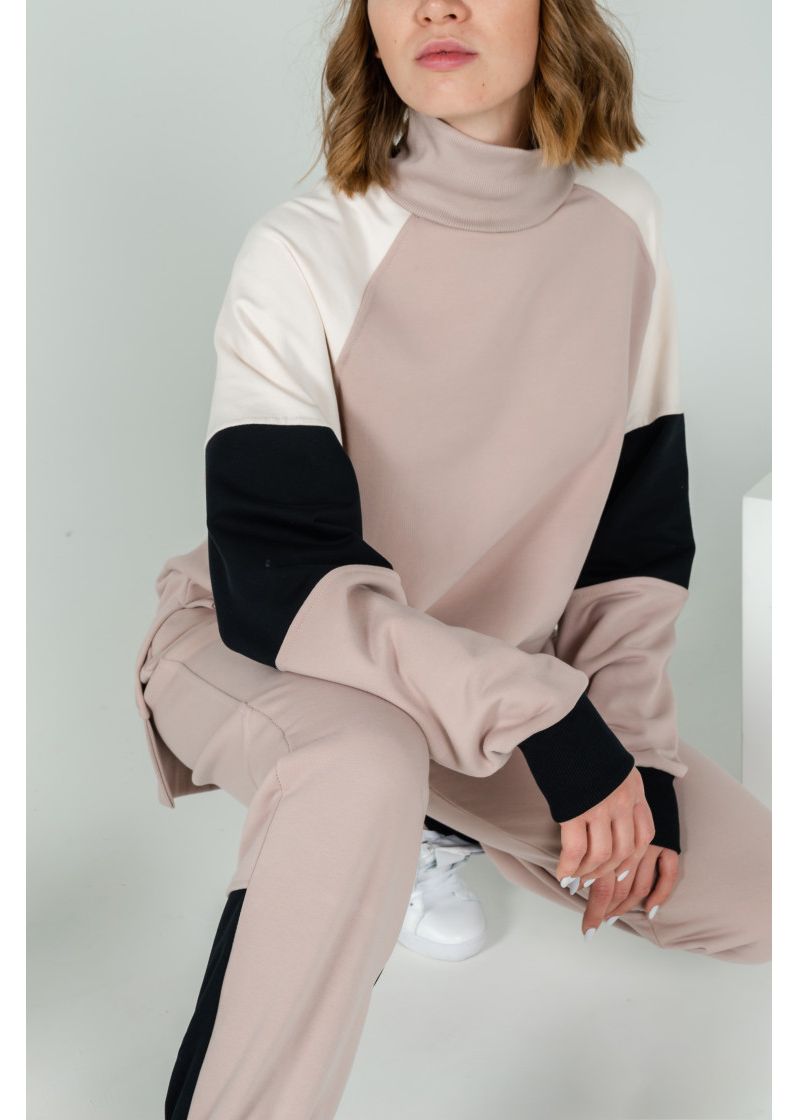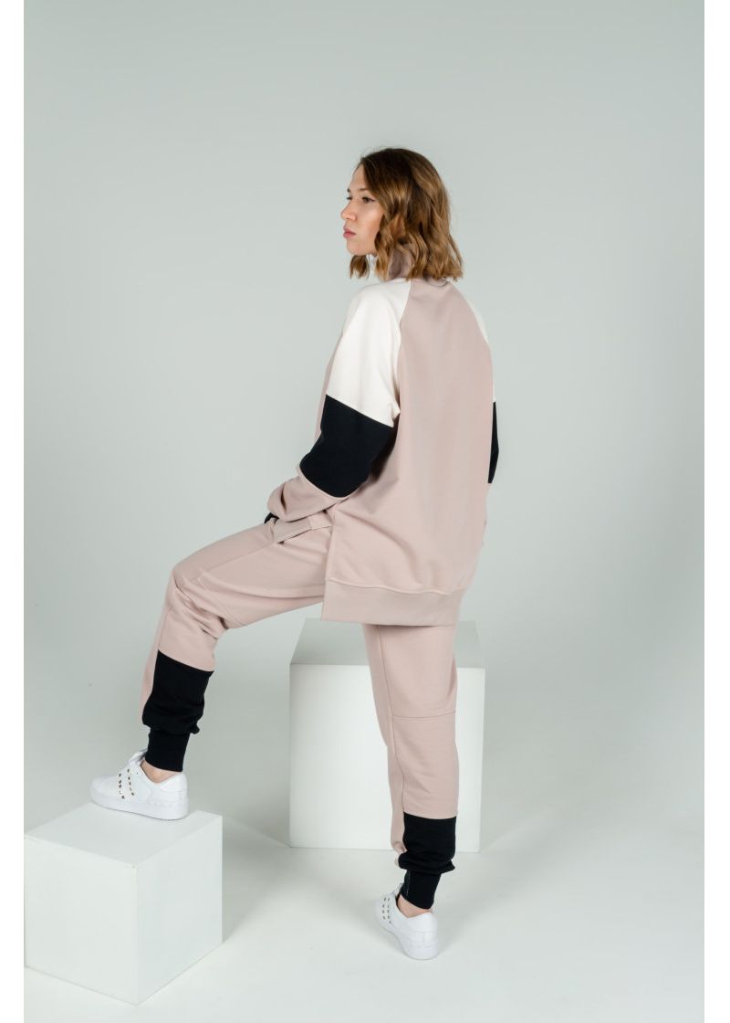 Оригинальный спортивный костюм. Выполнен из трех расцветок плотного и теплого футера. Толстовка с удлиненной спинкой, свободного кроя, два боковых разреза, рукава на широких манжетах. Брюки на манжетах, средняя посадка, широкий пояс-резинка.