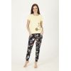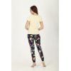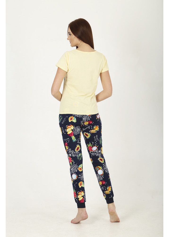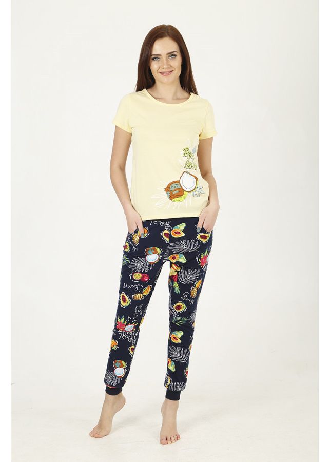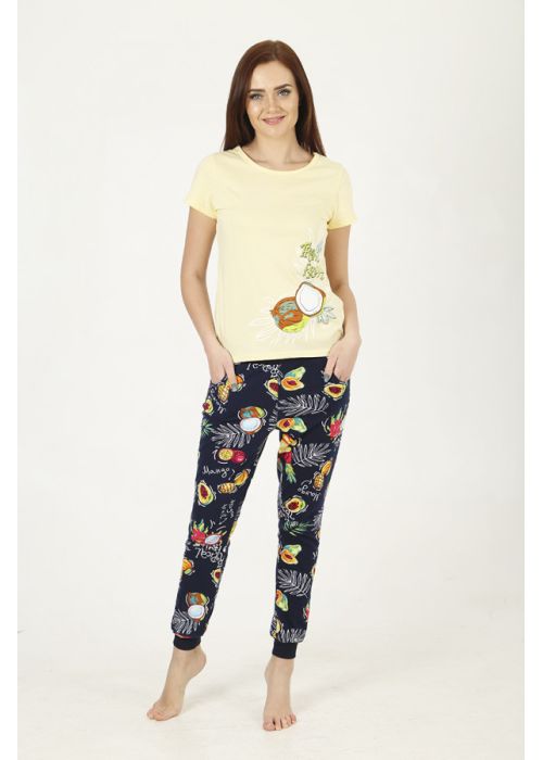 Костюм женский из трикотажного полотна. Футболка полуприлегающего силуэта длинной до уровня бёдер. Рукав втачной базового покроя короткий. Вырез горловины О-образный. На полочке присутствует печатный рисунок. Брюки полуприлегающего силуэта на манжете. Верхний срез обработан поясом на резинке. На левой передней половинке присутствует печатный рисунок и карманы в отрезном бочке.